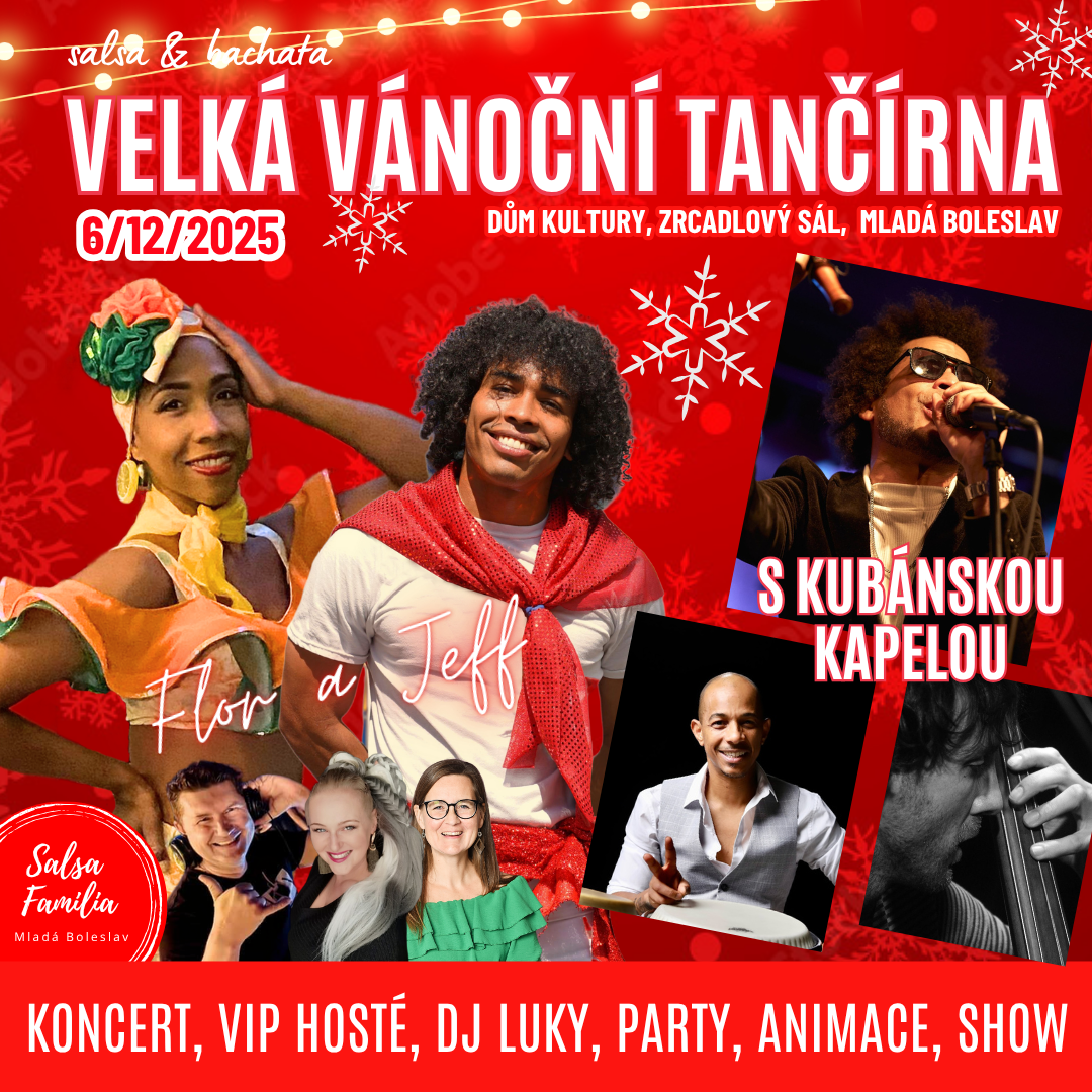 Je to tady!!! Naše báječná Vánoční tančírna s živou kapelou má datum, a to 6.12. Letos pro vás máme nové hosty Jeffa a Flor, na které se moc těšíme a jsme zvědaví. Hudbu zajistí opět kubánská kapela, ať to má to správné kouzlo a těšíme se na všechny taneční přátelé nejen z naší Salsa Familia, ale také z LBC, JBC, HK, Pardubic, Prahy, Ústí a jiných měst. Vždy vytvoříme krásnou Vánoční a přátelskou atmosféru plnou tance, radosti a pohody. Těšíme se na vás na všechny! Moc a moc a ještě víc! Pro koupi lístků volejte nebo pište na WA 604662603. FB událost zde.